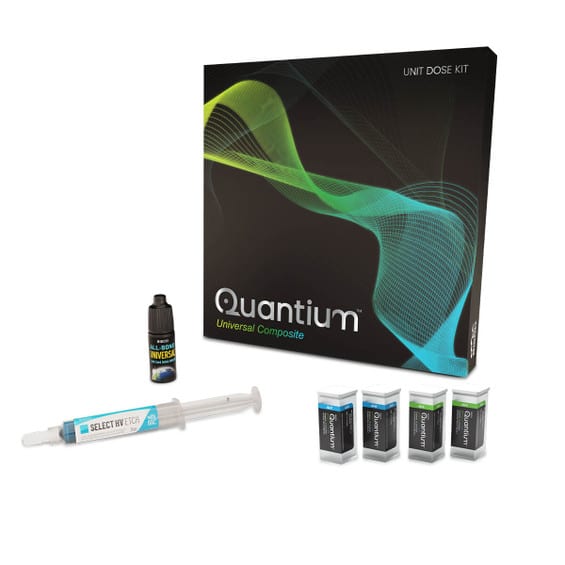 Quantium is available in six VITA® shades (A1, A2, A3, A3.5, B1, and B2), offered in both body and enamel opacities. Two effect shades — Bleach and Incisal — are also available. The composite is packaged in 4g syringes or 20-count 0.25g unit dose refills. Two introductory kits are also available, in syringe and unit dose formats, containing Quantium A2 and A3 body and enamel shades, along with All-Bond Universal® and Select HV® Etch with BAC. (VITA is a registered trademark of VITA ZAHNFABRIK H. Rauter GmbH & Co. KG. Germany.)