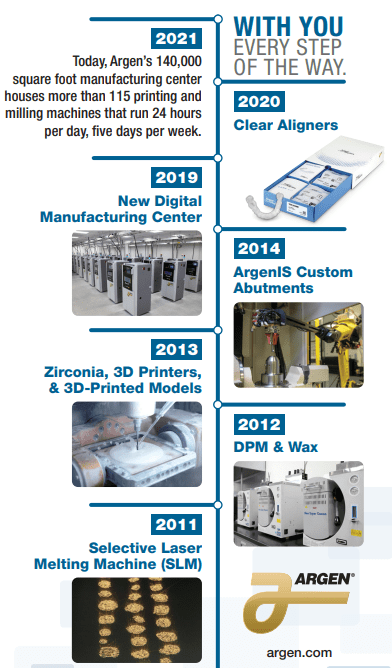 The Argen Corporation, a leading innovator of digital dentistry solutions, is proud to celebrate their 10-year anniversary of going digital. Since starting in 2011 with a single Selective Laser Melting machine, Argen's digital services have evolved into a robust, 140,000 square foot manufacturing facility that utilizes diverse milling and printing techniques with over 115 machines.