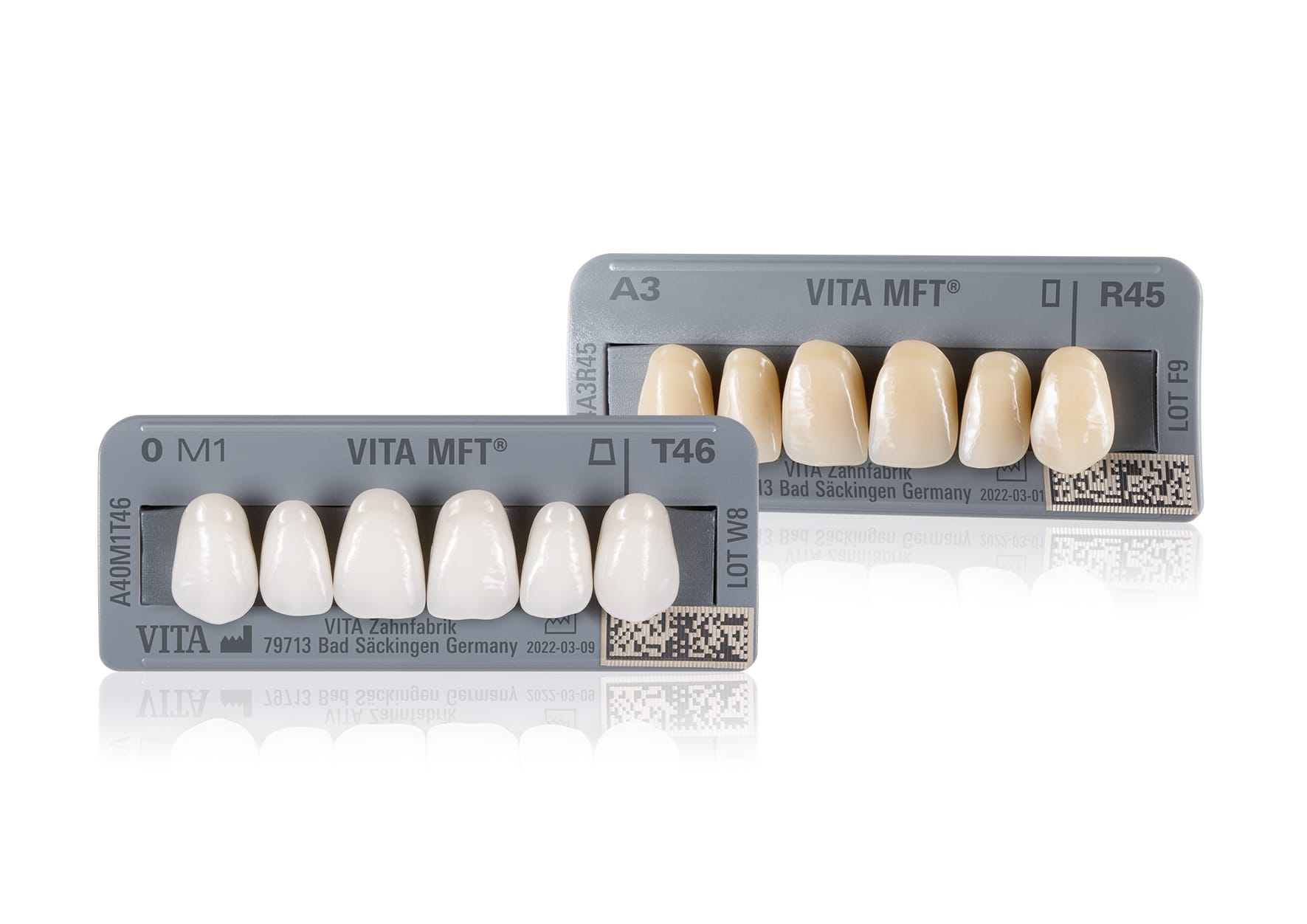 VITA MFT is an economy tooth with premium quality and design, and can be used for full and partial prosthetics, as well as for hybrid and implant prosthetics. A functionally-optimized design of the occlusal surfaces offers a simplified and intuitive setup and freedom in centric with posterior teeth. The result: solid, reliable and esthetic prosthetics for anterior and posterior teeth.