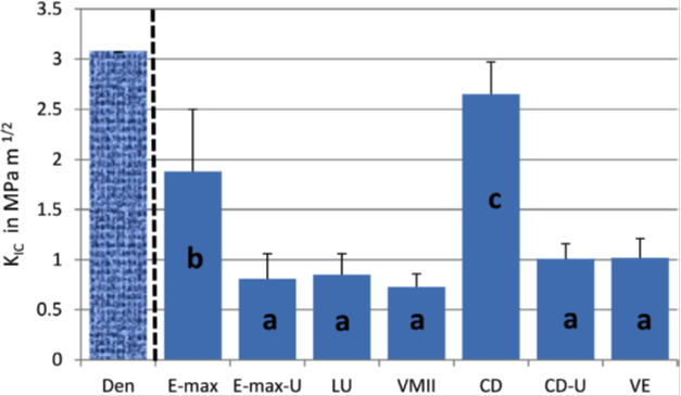 Celtra Duo (ZLS) and e.max had the notably highest mean toughness values, with Celtra Duo (ZLS) found to be higher than that of e.max. Both leading materials had a substantial increase in fracture toughness after firing. Although the mean KIC values of the tested materials varied considerably, none were able to reach the mean KIC of natural dentin, previously reported at 3.08 MPa m1/2.